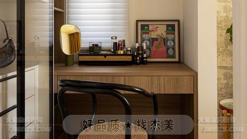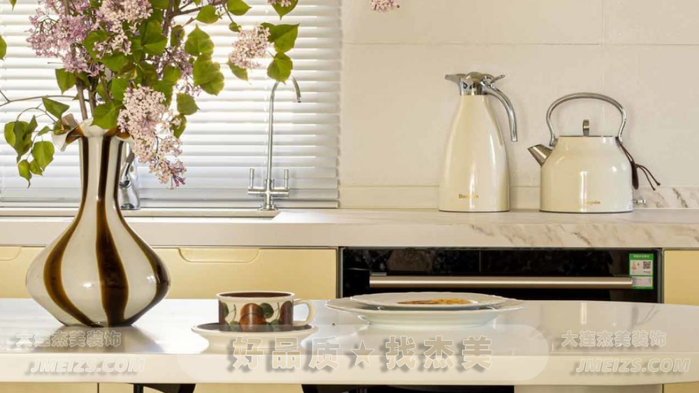 餐廳和廚房連成一體,沒有隔墻,沒有門,只有一張圓桌和四把餐椅,讓我們和廚房保持互通。杰美裝飾設(shè)計師在這里用靠墻增設(shè)島臺的方式來擴(kuò)大餐廚空間的使用率和儲物功能。島臺上有一個蒸烤箱和一個洗碗機(jī),都是嵌入式設(shè)計,釋放了廚房操作空間。島臺下有一個展示柜區(qū),主要用來置放女屋主的包包,下方還有一組屜柜,收納飾品或其他小物。