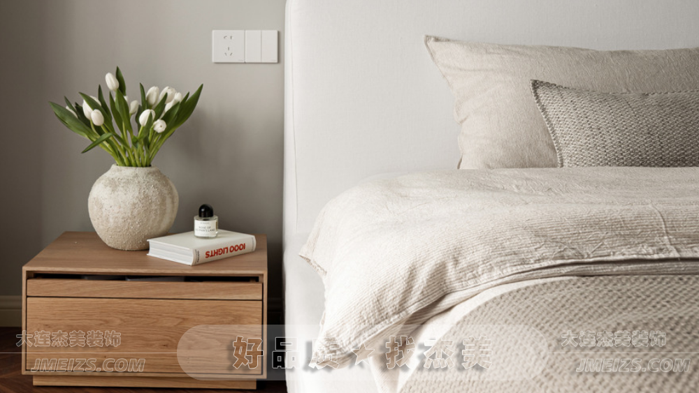 床頭的半墻延續(xù)了整體空間的風(fēng)格,淺色系的設(shè)計(jì)為空間增添了層次感。整體搭配簡約和諧,也便于使用日常物品。