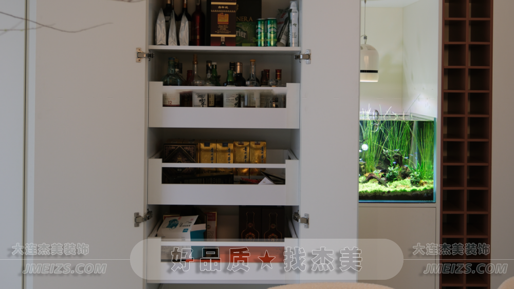 男主人鐘愛的魚缸被巧妙地嵌入到收納柜中,形成一個自然的生態(tài)系統(tǒng),帶來治愈的效果。