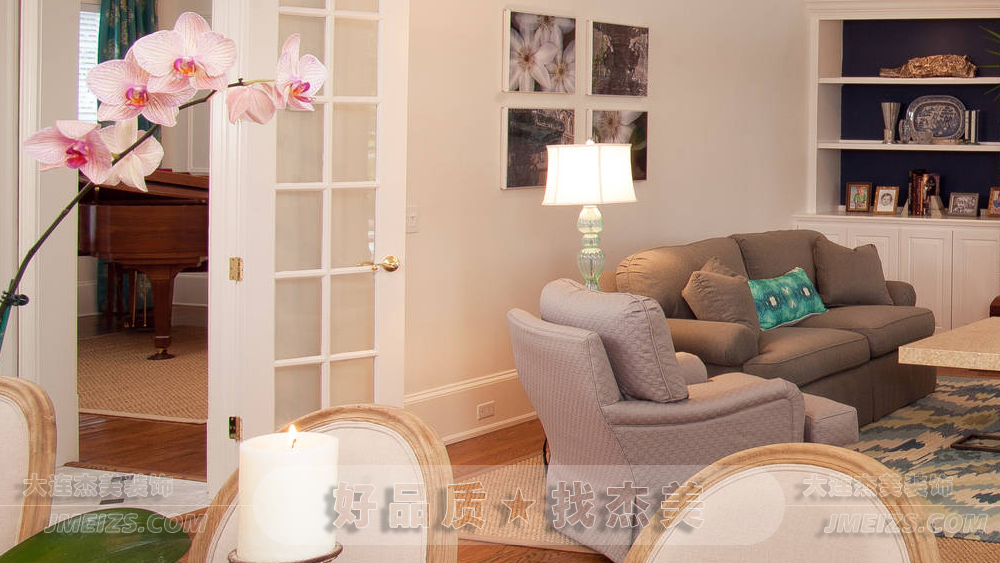 融合現代與古典風格的開放式客廳,大連杰美裝修設計師通過色彩、軟裝和細節(jié)處理,打造出舒適優(yōu)雅的起居氛圍。